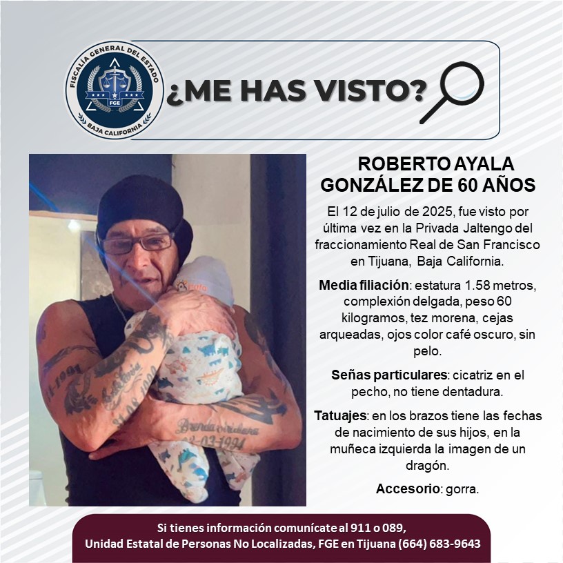 • La Fiscalía General del Estado (FGE), solicita el apoyo de la ciudadanía para localizar a Roberto Ayala González de 60 años de edad.