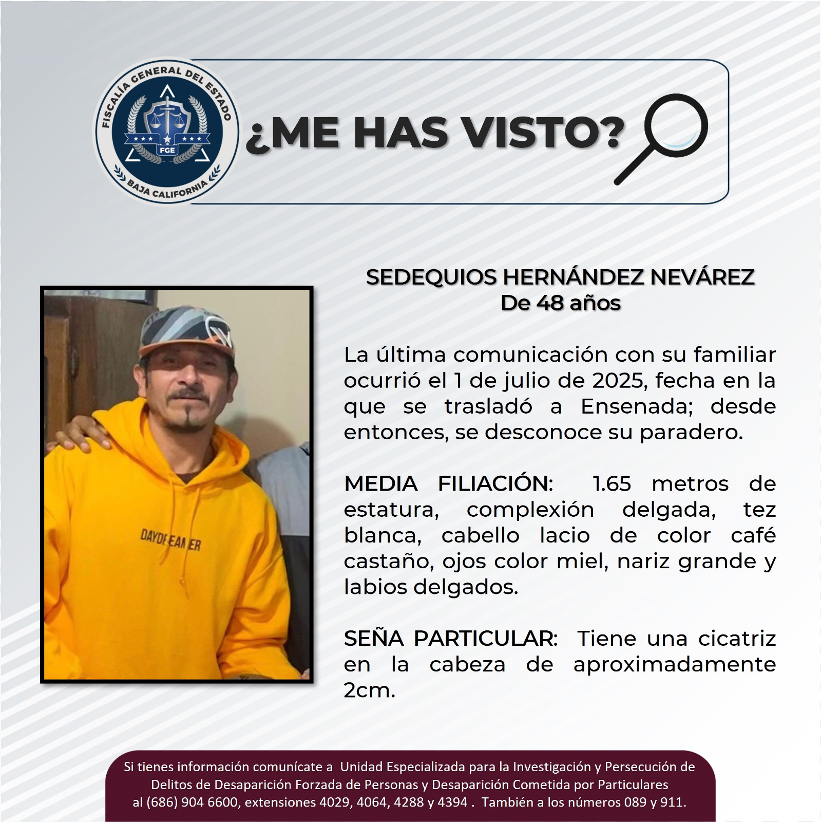 • La Fiscalía General del Estado, a través de la Unidad para la Investigación y Persecución de Delitos de Desaparición Forzadas de Personas y Desaparición Forzada cometida por Particulares, solicita la colaboración de los ciudadanos para localizar a Sedequios Hernández Nevárez de 48 años.