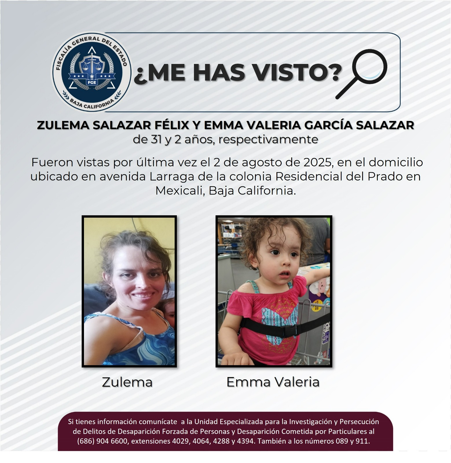 - La Fiscalía General del Estado (FGE), a través de la Unidad para la Investigación y Persecución de Delitos de Desaparición Forzadas de Personas y Desaparición Forzada cometida por Particulares, solicita la colaboración de los ciudadanos para localizar a Zulema Salazar Félix y Emma Valeria García Salazar de 31 y 2 años, respectivamente.