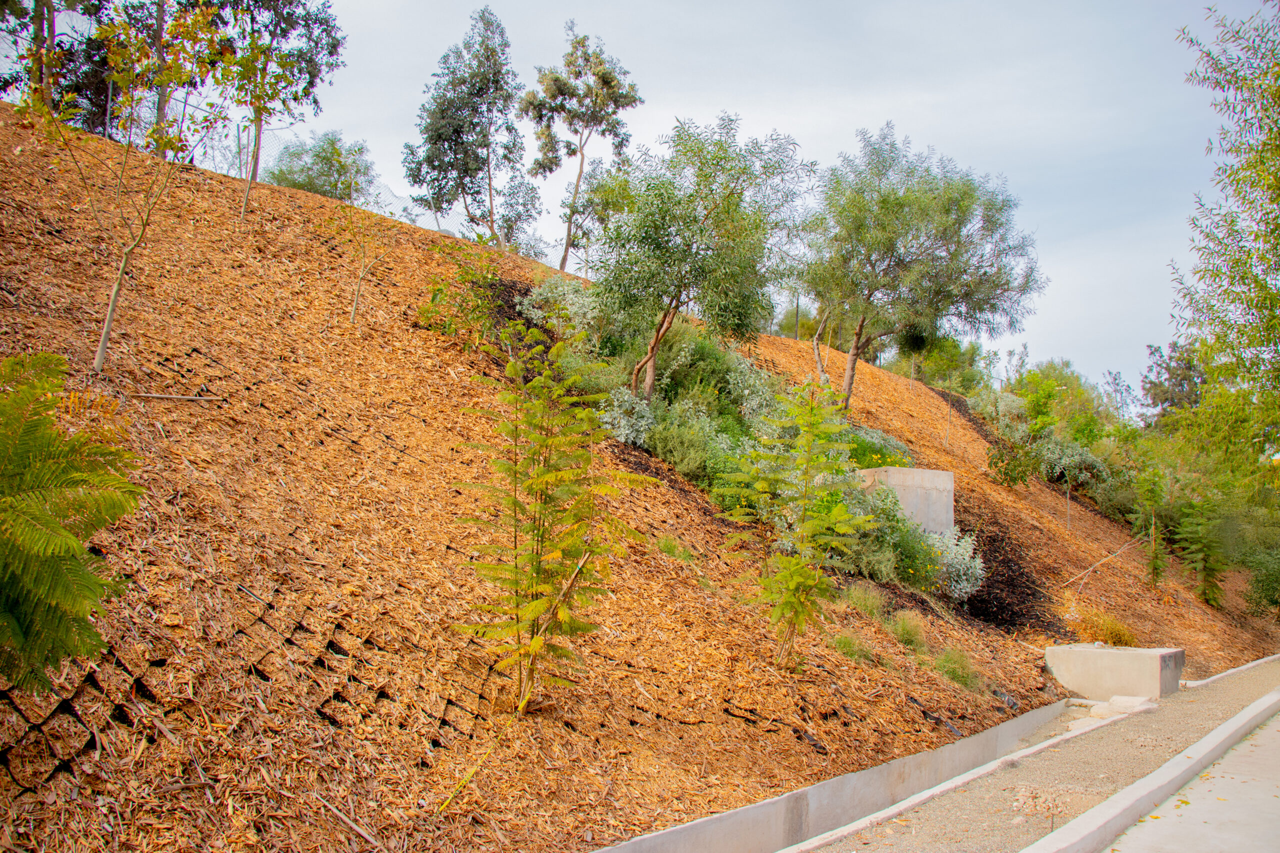 La directiva destacó que este tipo de intervención disminuye la presión sobre los drenajes pluviales y canales, además de transformar taludes antes desaprovechados en espacios funcionales y visualmente atractivos, como áreas recreativas con senderos y árboles de sombra.