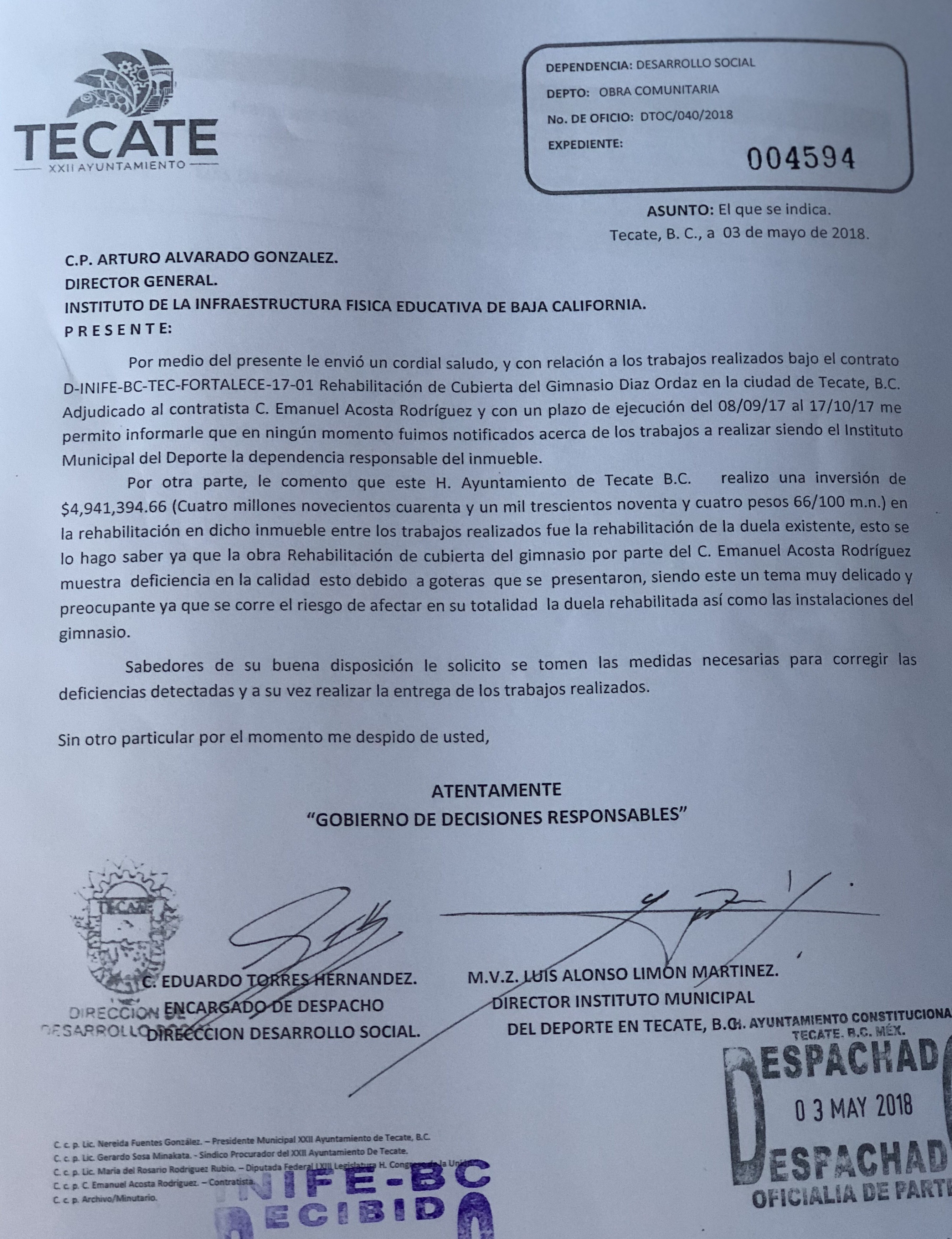 Respecto a la rehabilitación de la cubierta del Gimnasio Municipal, Gustavo Díaz Ordaz, el Gobierno Municipal de Tecate, informa a través de la Dirección de Desarrollo Social Municipal y el Instituto Municipal del Deporte que se emitió un oficio con número DTOC/040/2018, al Instituto de la Infraestructura Física Educativa del Gobierno de Baja California, solicitando informes sobre el estado de la rehabilitación de cubierta antes mencionada, en el sentido que se tomen las medidas necesarias para corregir las deficiencias en la obra realizada el año pasado, las cuales están afectando la reciente rehabilitación de la duela de básquetbol, a su vez impide la práctica del deporte en el inmueble.