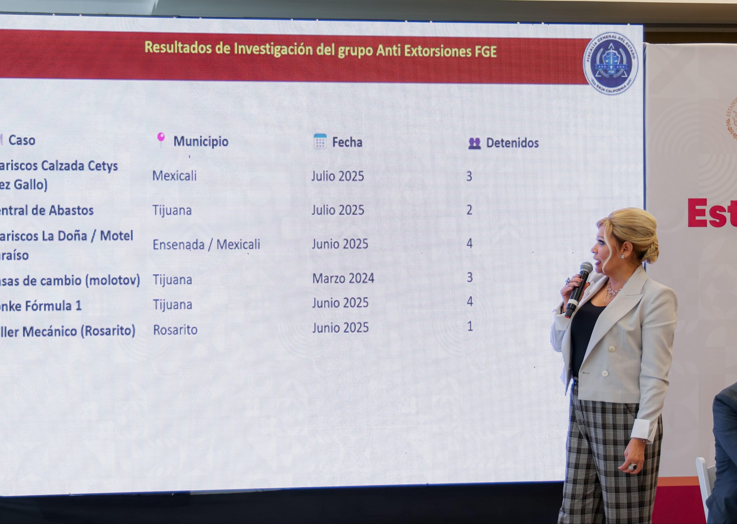 Finalmente la fiscal General del Estado de Baja California, Ma. Elena Andrade Ramírez mencionó que como resultado de las investigaciones del grupo Antiextorsiones de esa corporación, en lo que va 2025 se han logrado 17 detenciones relacionadas con la comisión de dicho delito, lo que refleja la coordinación interinstitucional para combatirlo.