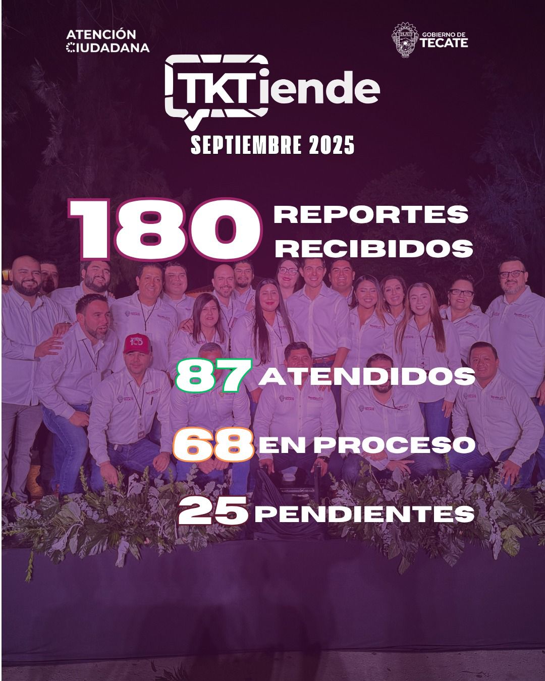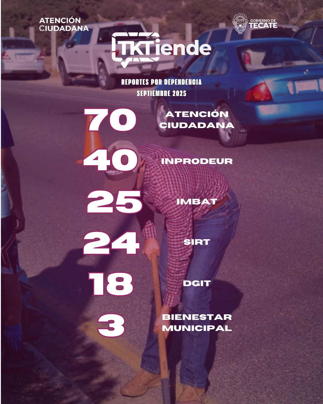 - El Gobierno de Tecate dio a conocer la información consolidada del programa “TKTiende” correspondiente al mes de septiembre, destacando la participación activa de la ciudadanía y el compromiso de las dependencias municipales por atender de manera oportuna las necesidades de la comunidad.