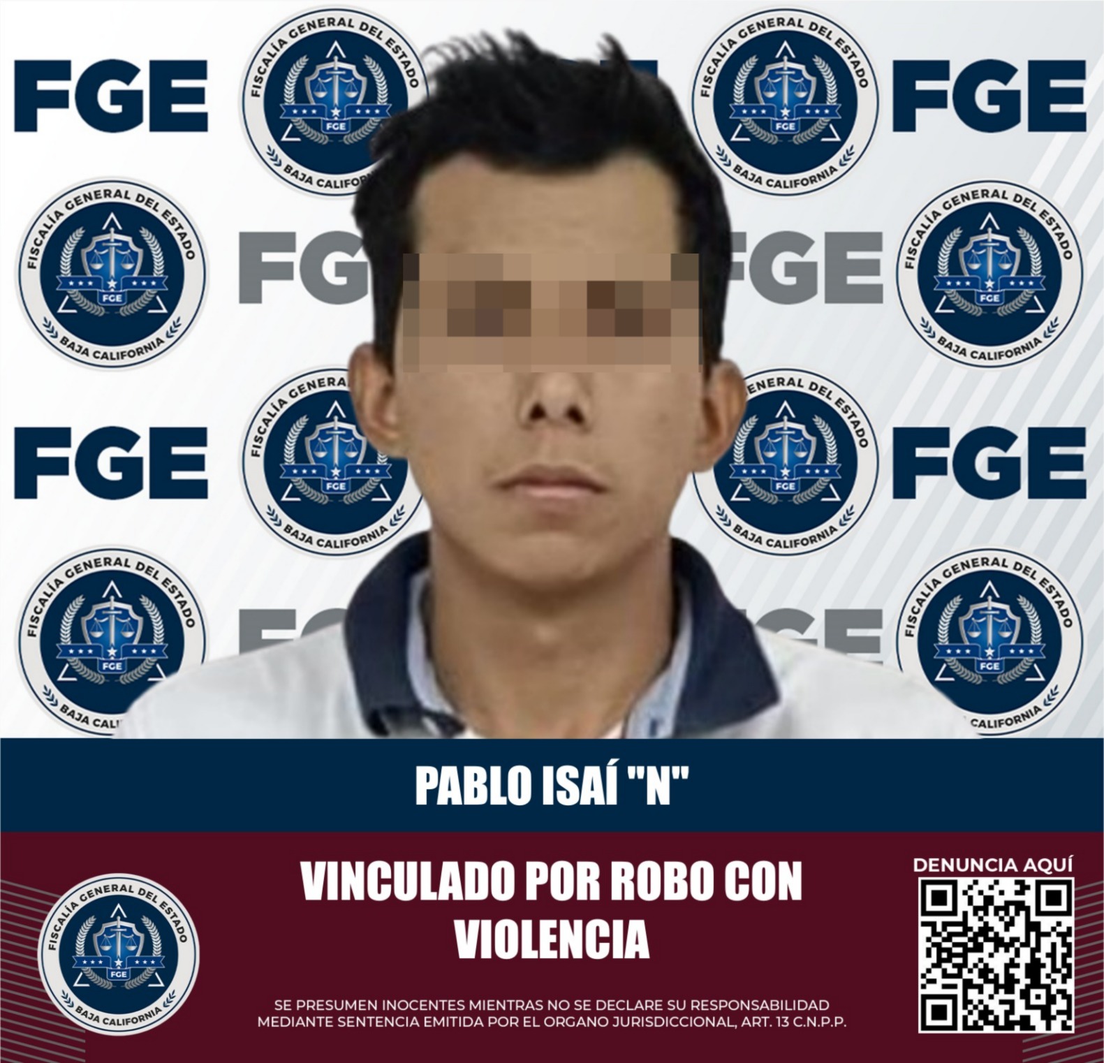 La Fiscalía Regional de Tecate informó que, a través de la Unidad de Investigación de Delitos con Detenido, logró vincular a proceso a Pablo Isaí “N” por el delito de robo con violencia.
