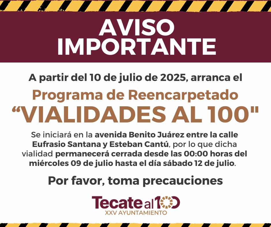El Gobierno de Tecate informa a la ciudadanía que será a partir del jueves 10 de julio de 2025 cuando dé inicio el programa de reencarpetado “Vialidades al 100”, una acción prioritaria de la administración que encabeza el alcalde Román Cota Muñoz, para mejorar de forma integral las condiciones de las principales vialidades del municipio.