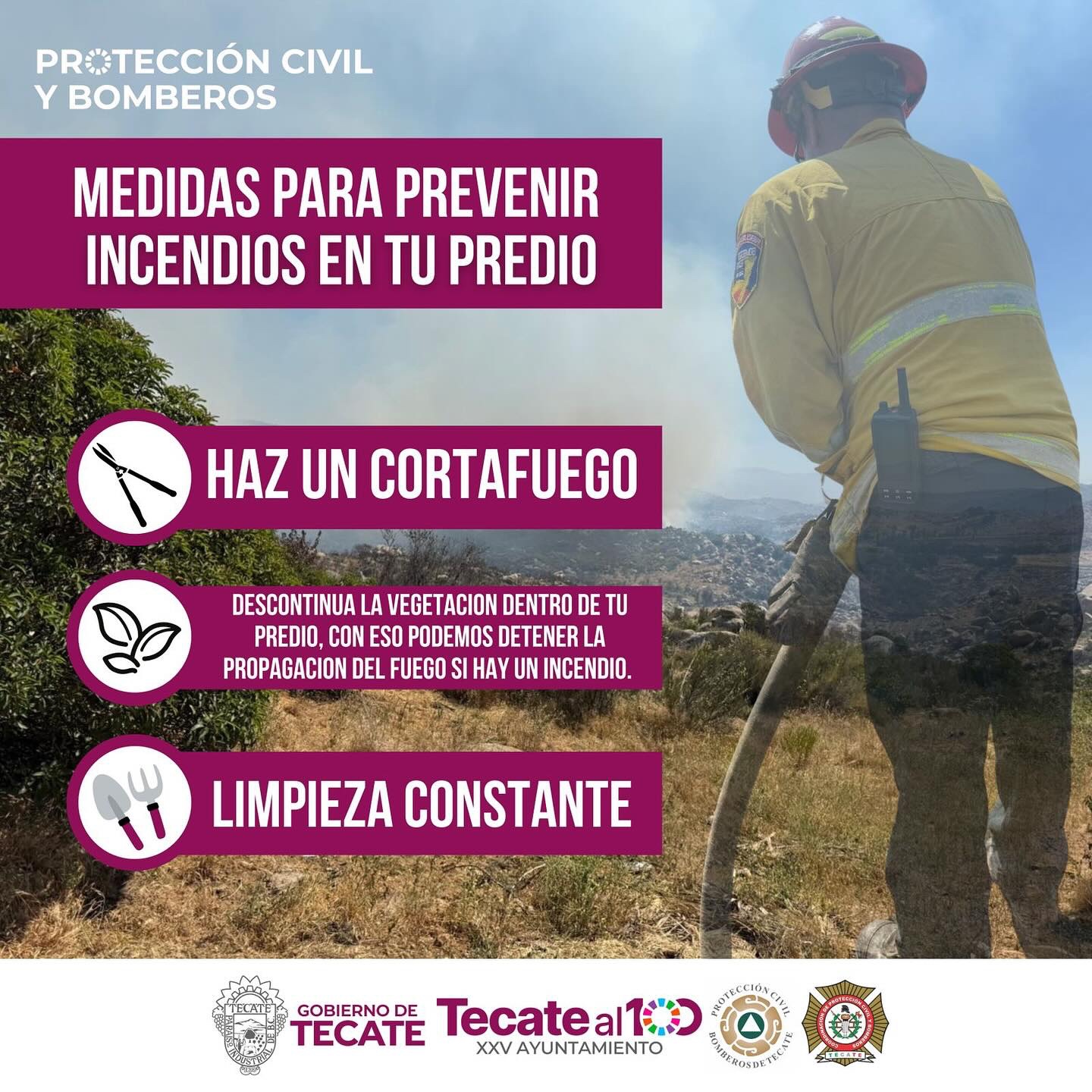Ante el incremento de las temperaturas y el inicio de la temporada de calor en la región, el Gobierno de Tecate, a través de la Coordinación Municipal de Protección Civil y Bomberos, hace un llamado a la población para implementar acciones preventivas que reduzcan el riesgo de incendios forestales y urbanos, especialmente en predios baldíos o con vegetación.