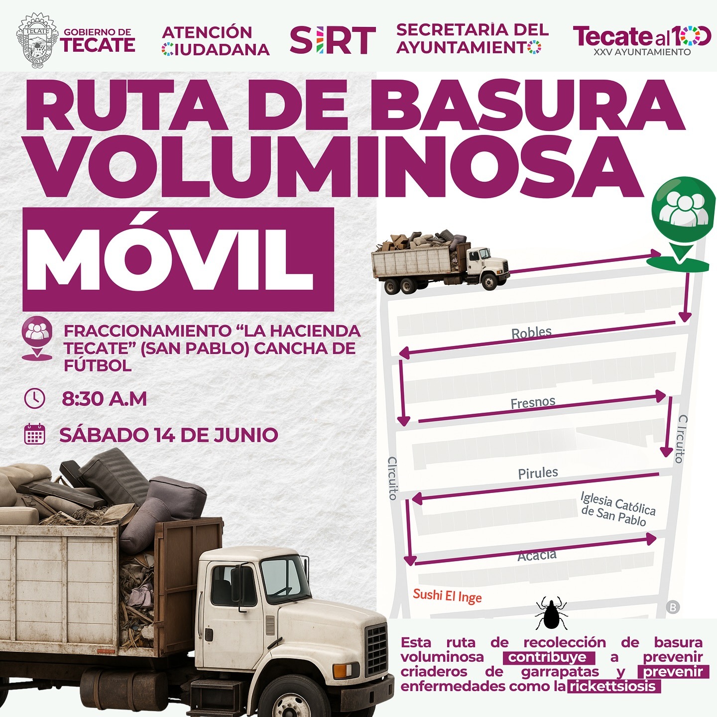 Con el objetivo de mantener entornos más limpios y saludables para las familias tecatenses, el Gobierno de Tecate, a través de Servicios Integrales de Residuos de Tecate (SIRT), llevará a cabo una Ruta de Basura Voluminosa Móvil este sábado 14 de junio en el fraccionamiento La Hacienda (San Pablo), a partir de las 8:30 de la mañana.