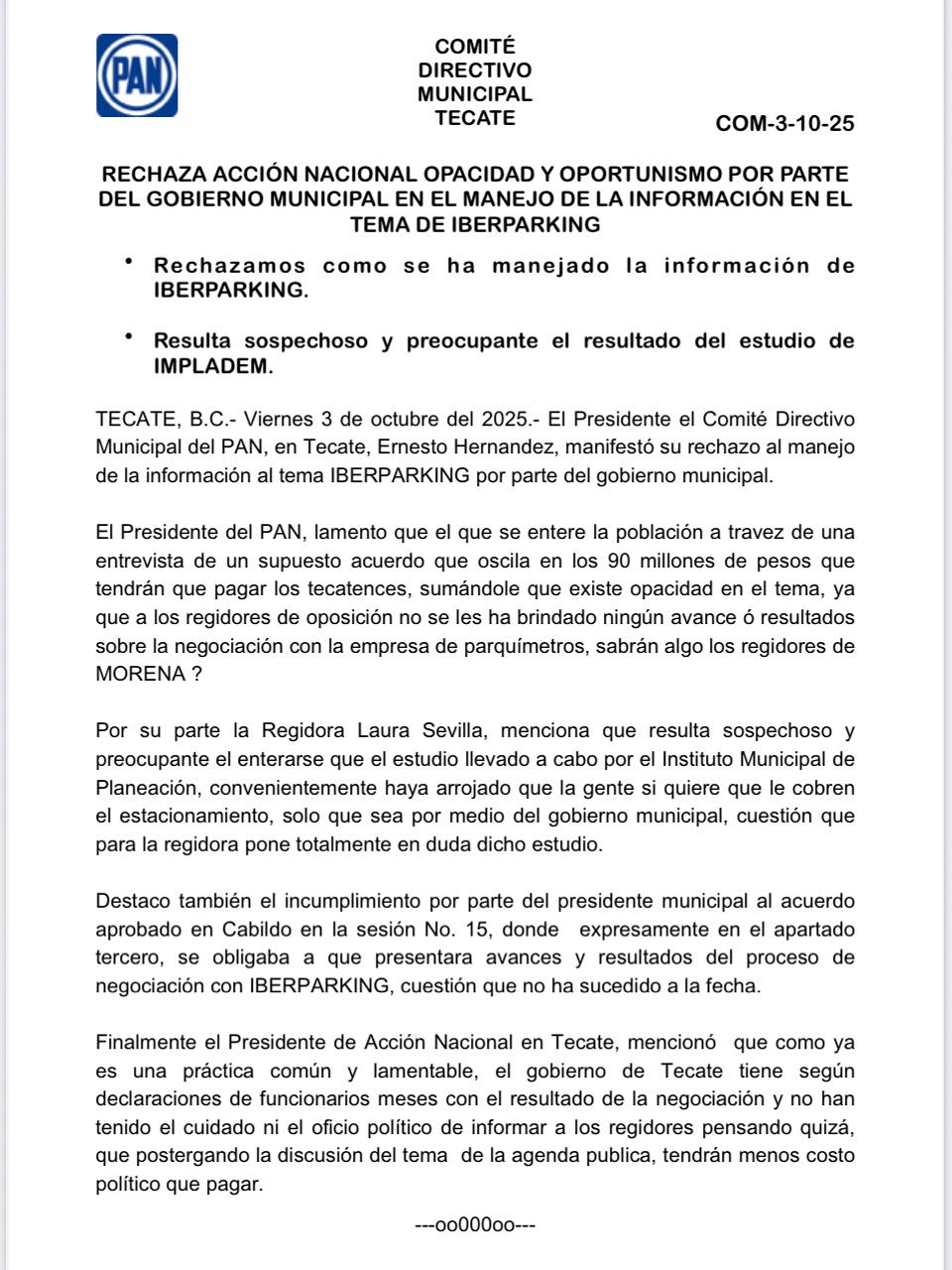 El Comité Directivo Municipal del Partido Acción Nacional (PAN) en Tecate expresó su rechazo al manejo de la información por parte del Gobierno Municipal respecto al proceso de terminación del contrato con la empresa Iberparking, concesionaria del sistema de parquímetros en la ciudad.