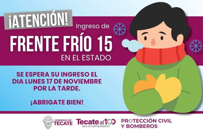 - El Gobierno de Tecate, a través de la Coordinación Municipal de Protección Civil y Bomberos, informa a la ciudadanía sobre el próximo ingreso del frente frío número 15, el cual interactuará con una circulación ciclónica en altura y la corriente en chorro polar.