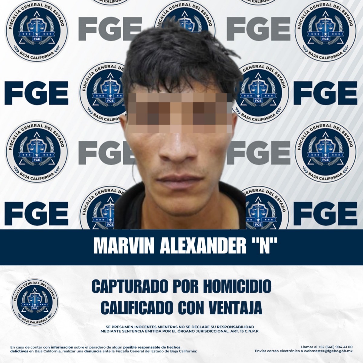 Derivado de labores de investigación, el 14 de enero de 2026 se dio cumplimiento a la orden de aprehensión, quedando Marvin Alexander “N” a disposición del Juzgado de Control del Poder Judicial del Estado de Baja California. Al momento de su detención, se le hizo de su conocimiento el motivo de la misma, así como la lectura de sus derechos constitucionales, para posteriormente ser puesto a disposición de la autoridad judicial que ordenó su captura.