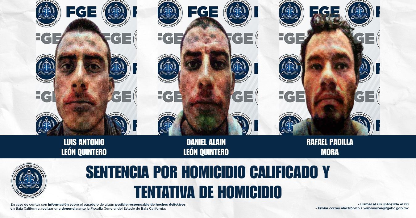 La Coordinación de Averiguaciones Previas y Control de Proceso, adscrita a la Fiscalía Regional de Tijuana, obtuvo sentencia condenatoria de 50 años de prisión en contra de tres individuos por los delitos de homicidio calificado con premeditación, ventaja y alevosía, así como homicidio calificado en grado de tentativa, por hechos registrados el 9 de julio de 2014 en la colonia Obrera, Tercera Sección.