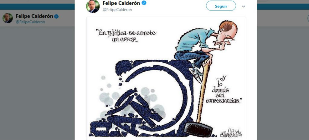 El ex presidente difundió en su cuenta de Twitter este cartón publicado por Calderón en Reforma este martes, sin hacer ningún comentario al respecto y con dedicatoria al candidato del Frente, Ricardo Anaya, quien dijo en el pasado debate la misma frase a la que se hace referencia: «En política se comete un error y lo demás son consecuencias».