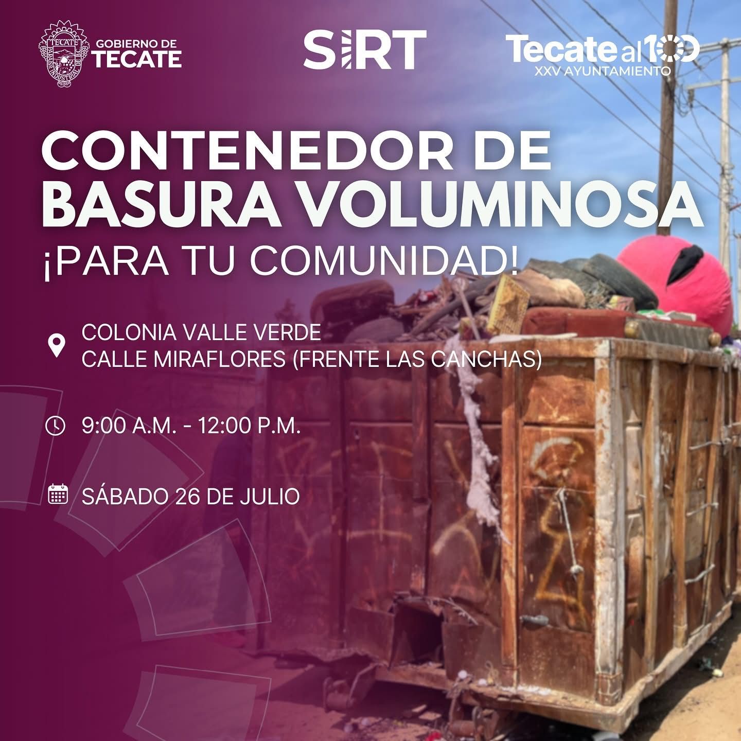 - Como parte de las acciones permanentes para mantener una ciudad más limpia y ordenada, el Gobierno de Tecate a través de Servicios Integrales de Residuos de Tecate (SIRT), llevará a cabo una jornada de recolección de basura voluminosa este sábado 26 de julio en las colonias Valle Verde y Bella Vista.