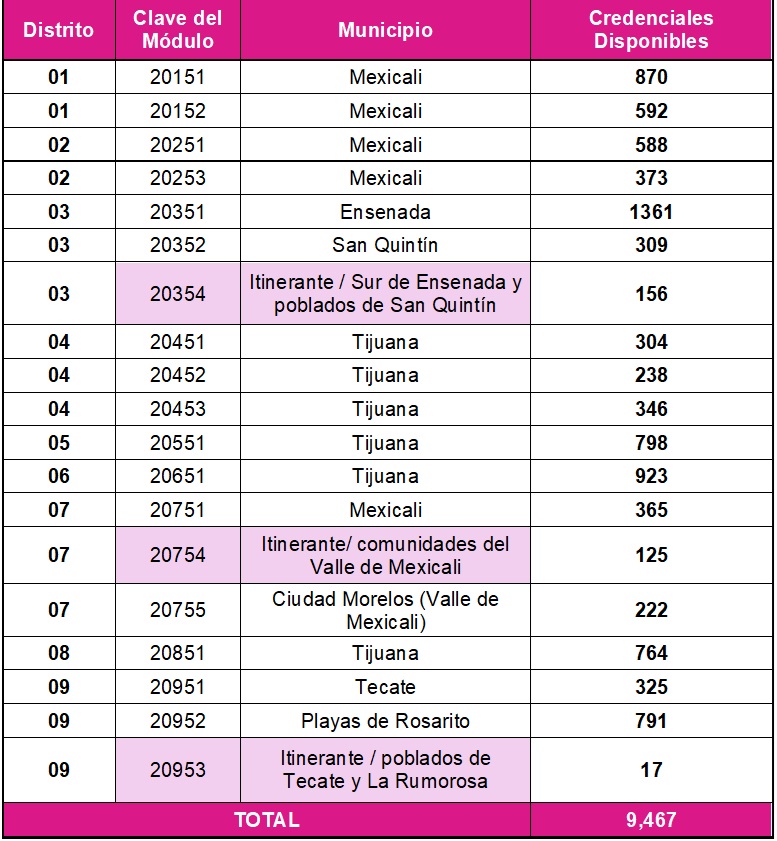 Juan Carlos Real Torres, Vocal del Registro Federal de Electores del INE BC, dio a conocer que son 9,467 Credenciales las que están disponibles en los 16 Módulos de Atención Ciudadana Fijos y 3 Módulos Itinerantes a nivel estatal: