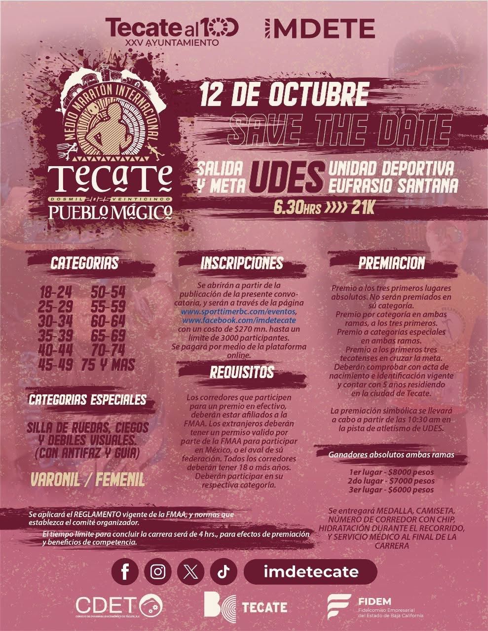El Gobierno de Tecate, a través del Instituto Municipal del Deporte (IMDETE), anuncia con entusiasmo la realización del Medio Maratón Internacional Tecate Pueblo Mágico 2025, el próximo 12 de octubre, teniendo como salida y meta la Unidad Deportiva Eufrasio Santana.