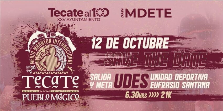 El Gobierno de Tecate, a través del Instituto Municipal del Deporte (IMDETE), anuncia con entusiasmo la realización del Medio Maratón Internacional Tecate Pueblo Mágico 2025, el próximo 12 de octubre, teniendo como salida y meta la Unidad Deportiva Eufrasio Santana.