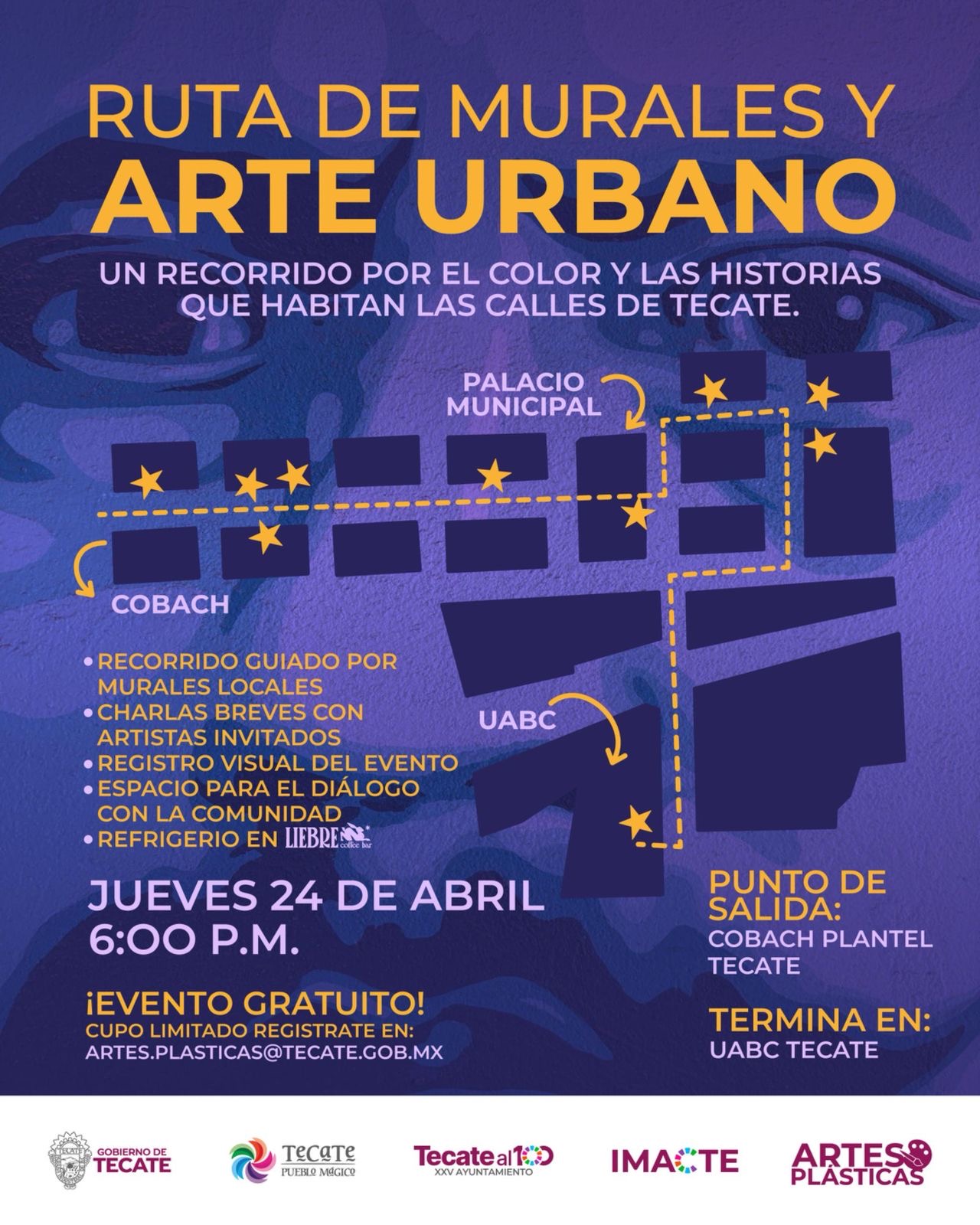 El recorrido, que iniciará en el Colegio de Bachilleres (COBACH) y culminará en las Instalaciones de la Universidad Autónoma de Baja California (UABC) plantel Tecate, incluirá un recorrido guiado por murales locales, charlas breves con artistas invitados, un registro visual del evento, un espacio para el diálogo con la comunidad y un refrigerio en Liebre Coffee Bar.
