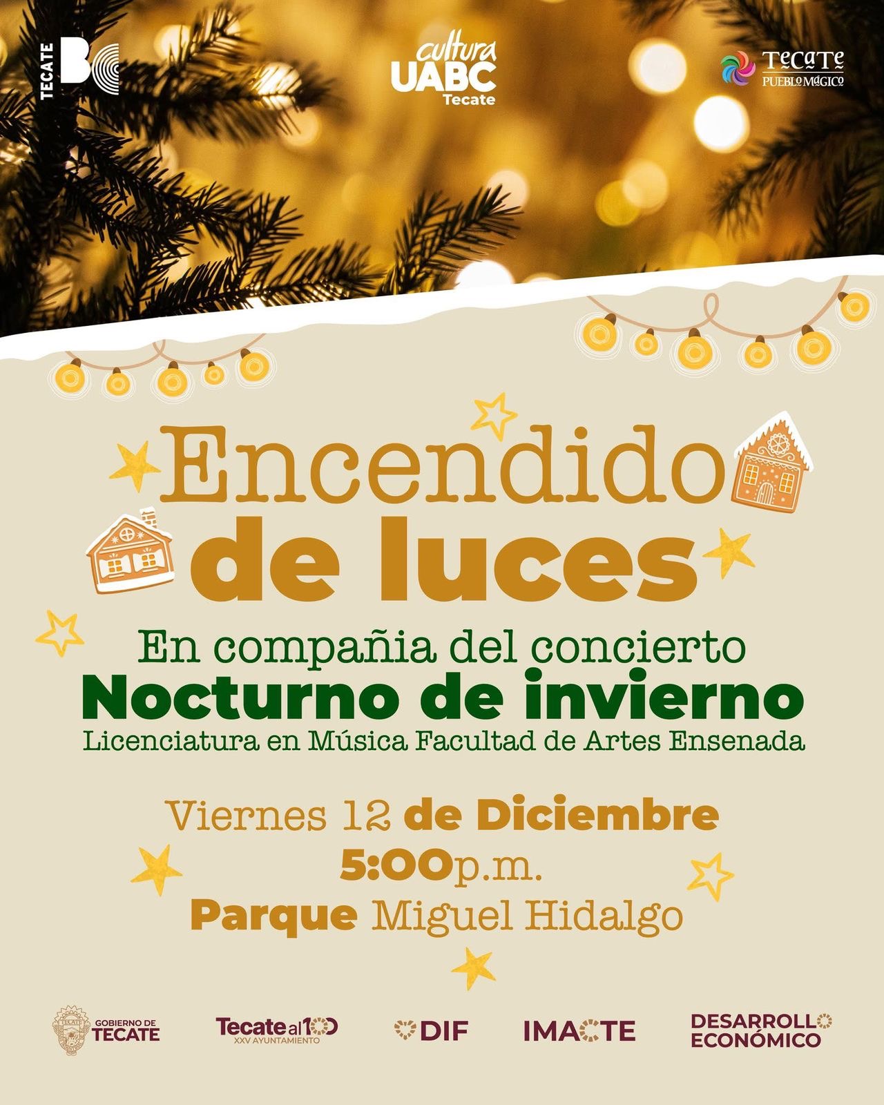 - El Gobierno de Tecate, que encabeza el alcalde Román Cota Muñoz, invita a todas las familias tecatenses a disfrutar del tradicional Encendido de Luces Navideñas, un evento que dará inicio a la temporada decembrina en un ambiente lleno de música y alegría.