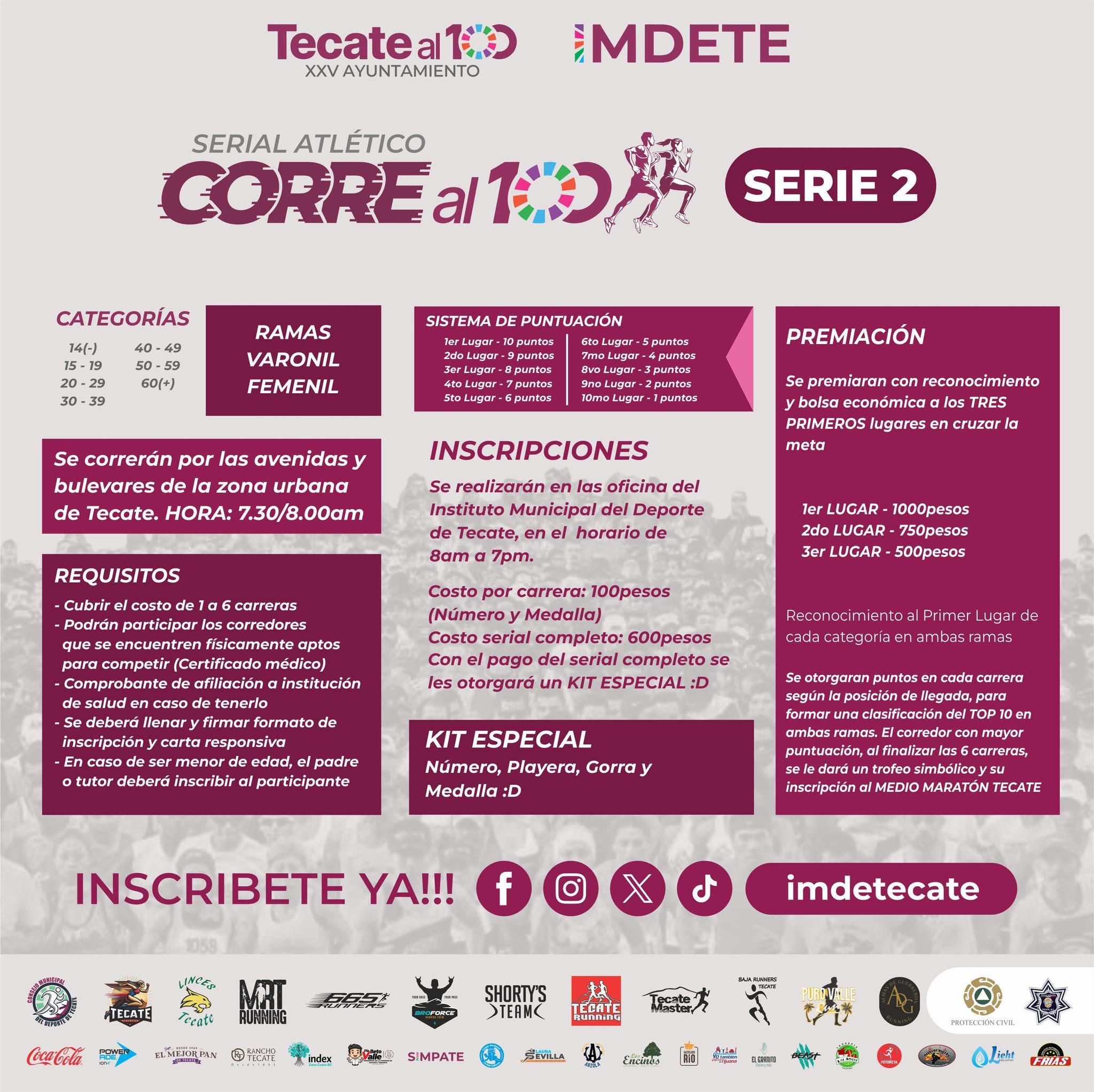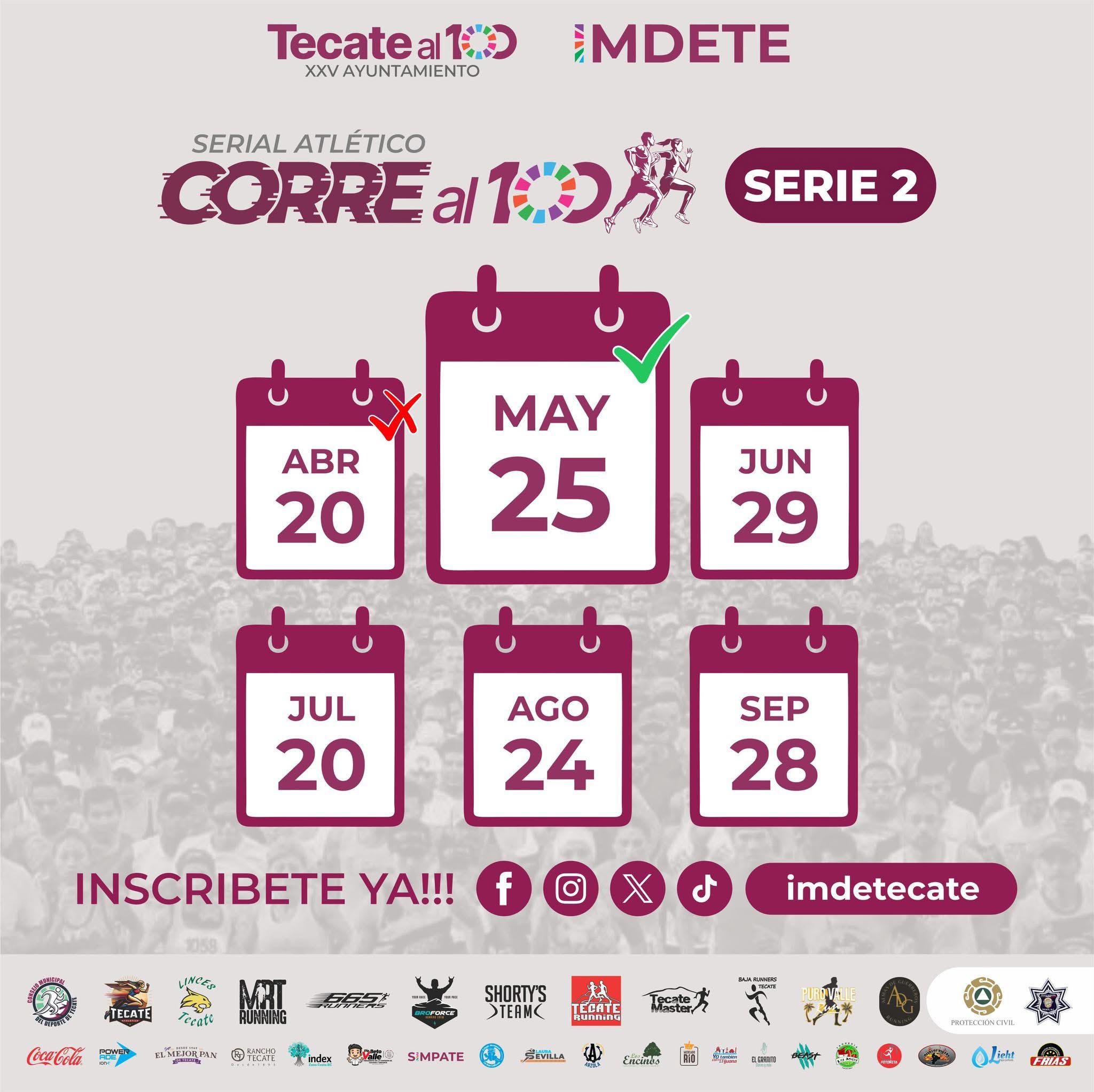 El Gobierno Municipal de Tecate, encabezado por el alcalde Román Cota Muñoz, a través del Instituto Municipal del Deporte (IMDETE), invita a toda la ciudadanía a participar en la segunda carrera del Serial Atlético “Corre al 100” – Serie 2, que se llevará a cabo el próximo domingo 25 de mayo como parte de las estrategias para fomentar el deporte, la salud y la sana convivencia social.