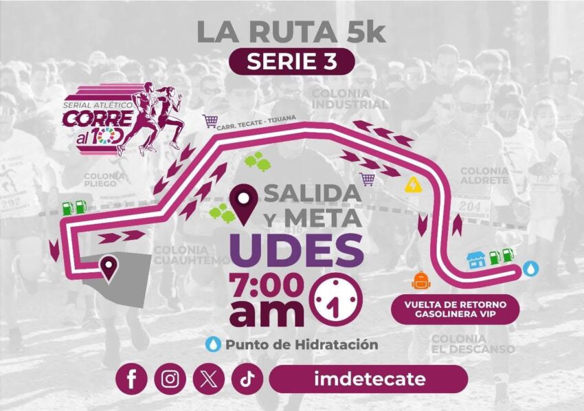 El Gobierno de Tecate, a través del Instituto Municipal del Deporte (IMDETE), informa que ya se encuentra todo listo para la realización de la tercera fecha del Serial Atlético “Corre al 100”, una actividad que busca fomentar la activación física, el bienestar y la sana convivencia entre la comunidad.