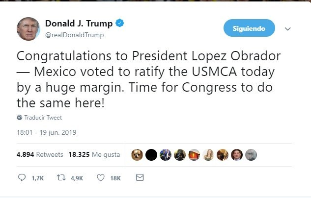 Felicidades al presidente López Obrador — México votó a favor de ratificar la USMCA hoy por un enorme margen. ¡Es hora de que el Congreso haga lo mismo aquí!