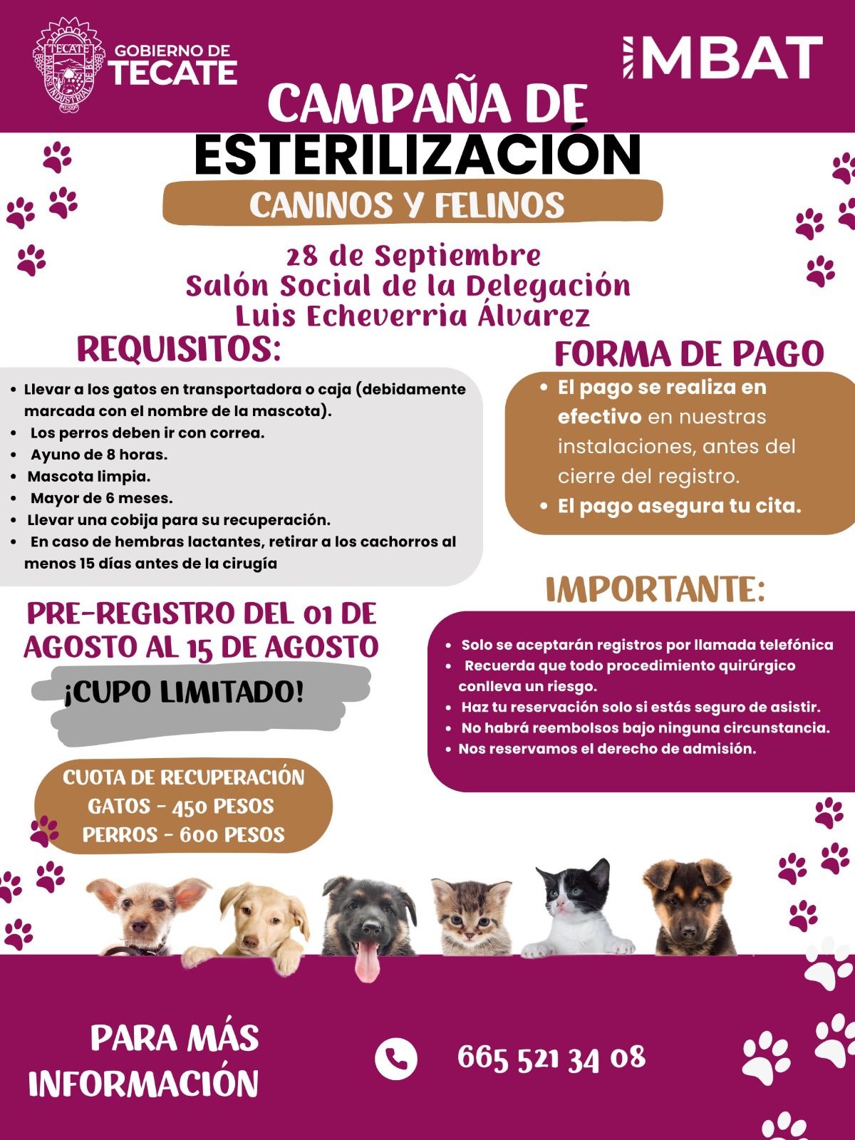 - La Campaña de Esterilización para Caninos y Felinos se llevará a cabo el 28 de septiembre en el Salón Social de la Delegación Luis Echeverría Álvarez (El Hongo).