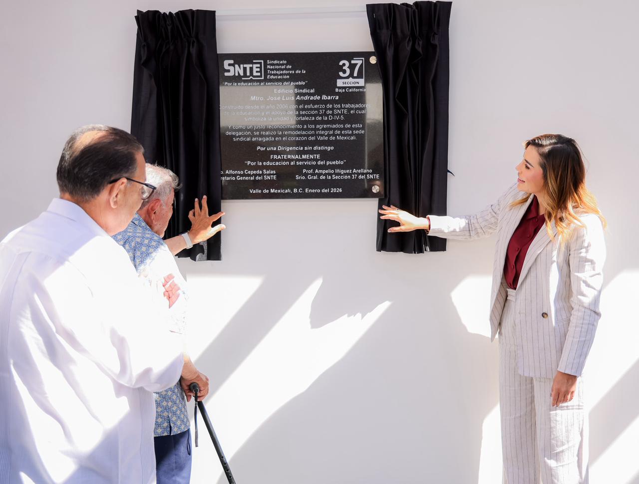 La mandataria también fue testigo de la reinauguración del edificio sindical de la Sección 37 en el Valle de Mexicali, que ahora lleva el nombre de José Luis Andrade Ibarra, docente jubilado y exsecretario general del sindicato, a quien reconoció como un actor fundamental en la conquista de los derechos del magisterio en México y en Baja California.