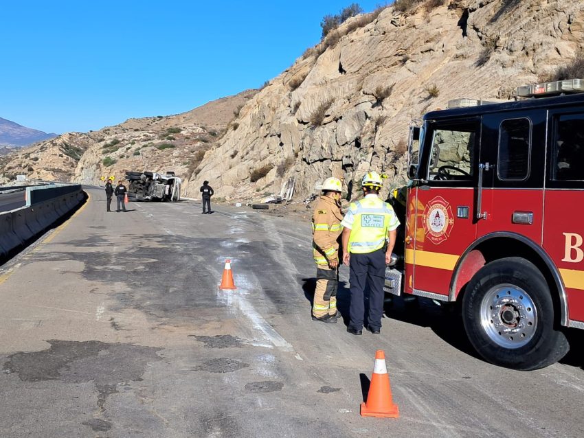 Una fuerte movilización de unidades de emergencia se registró este jueves tras la volcadura de un tractocamión perteneciente a la empresa de gas SILZA, en la autopista descendente que conduce de El Hongo a Tecate, a la altura del kilómetro 107.